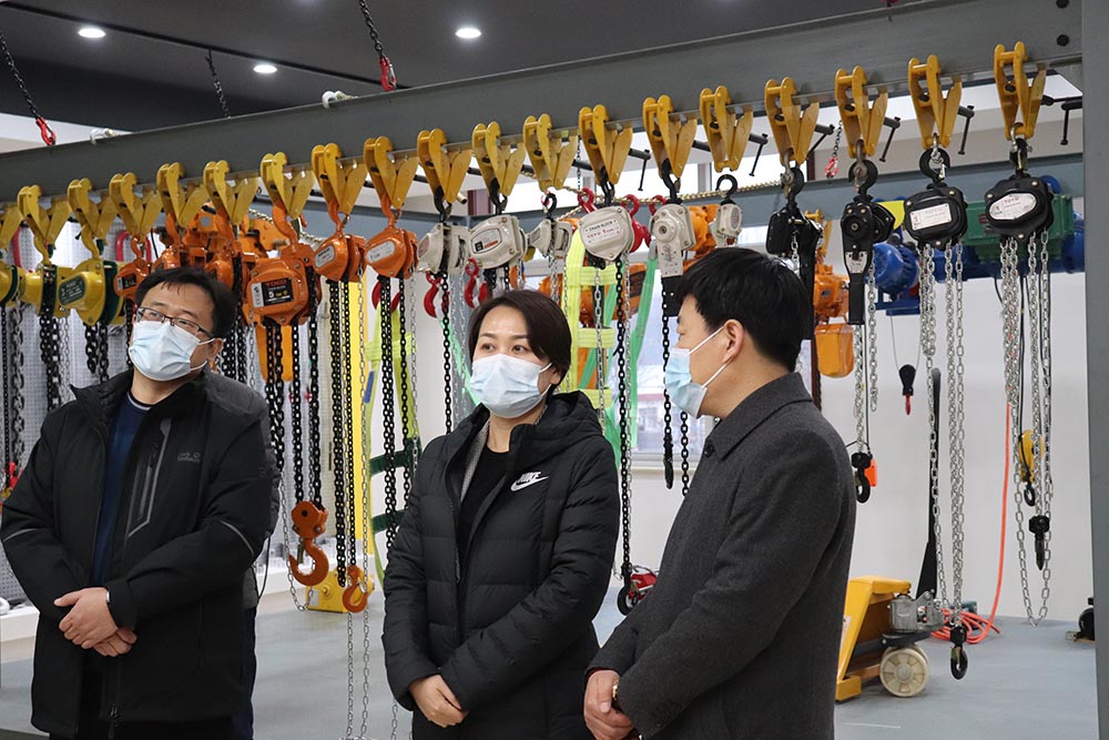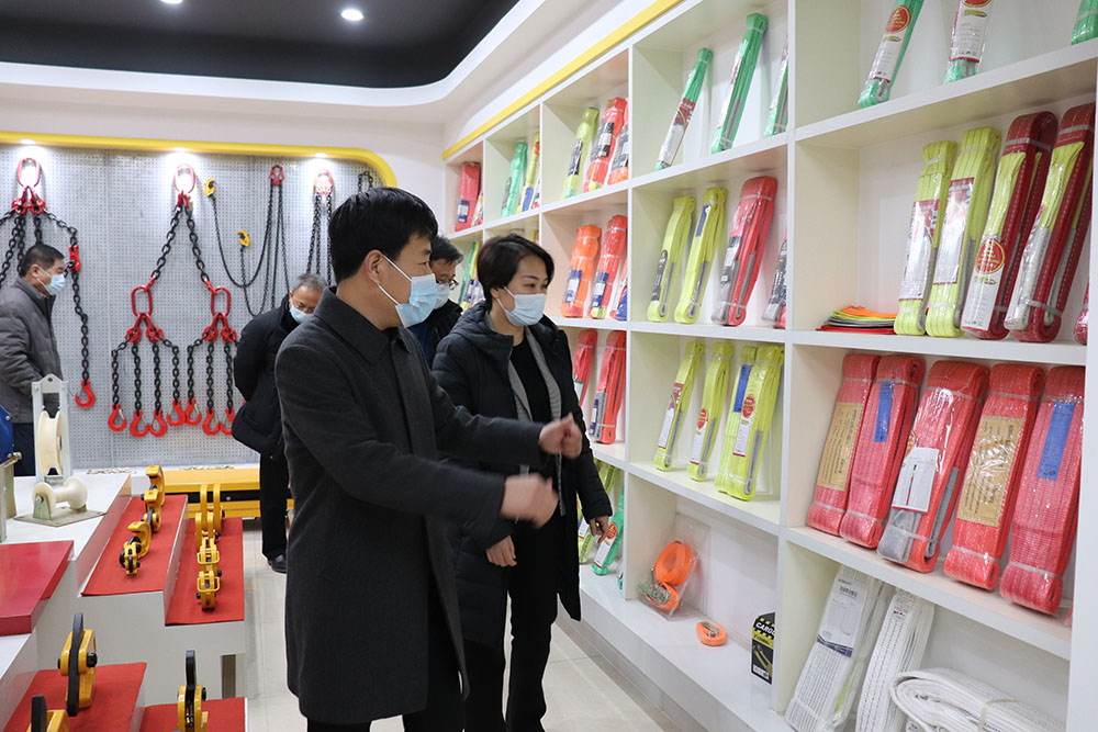 在產(chǎn)品展示廳里,劉丹區(qū)長聽取了蘇總經(jīng)理對吊裝帶、起重鏈條、手拉葫蘆等產(chǎn)品的介紹后,對我公司實力、產(chǎn)品質(zhì)量表示進一步肯定。同時詢問了公司在